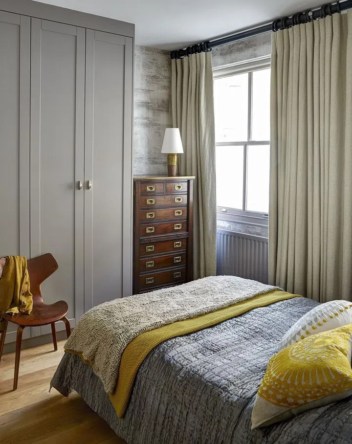 We love how good the vintage dresser and wainscoted wardrobe looks side by side! And yellow and grey make a gorgeous pairing, don't you think?