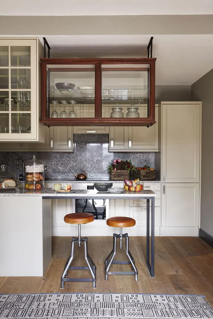The open-concept kitchen features suspended cabinetry with glass doors; this lets light into the kitchen area without sacrificing on storage.