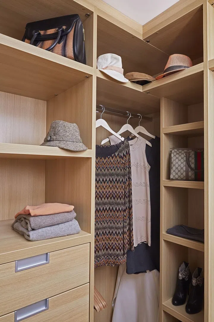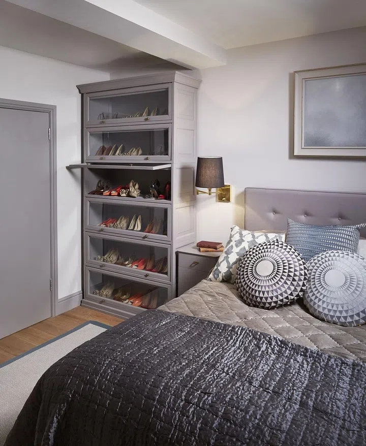 The homeowner is an avid shoe collector, so the Sigmar team designed a glass-door shoe rack to display (while keeping dust away from) her prized possessions.