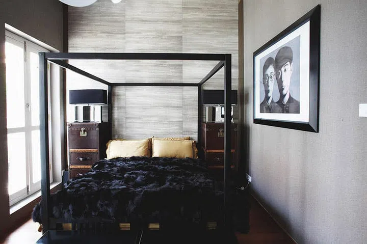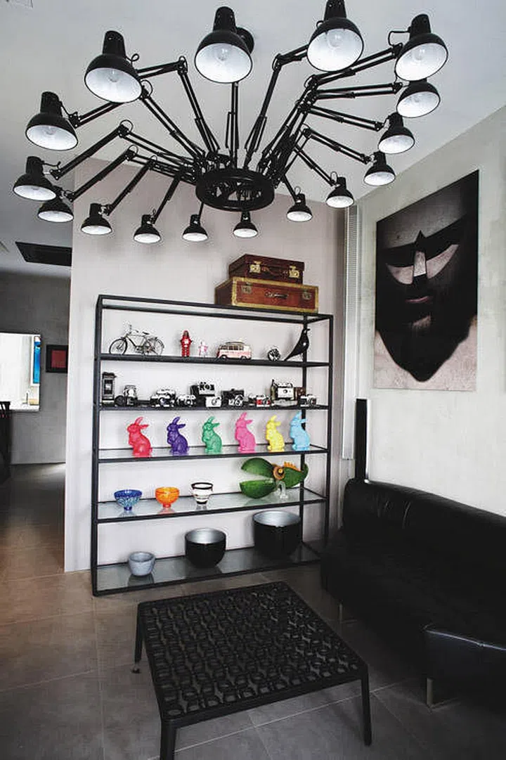 The living room/office zone is a bold mish-mash of looks: Vintage trunks and cameras sit alongside Paul Smith’s special series of rabbits. This eclectic combination of decorative elements showcases Alvin’s eye for curating unexpected pairings that somehow work harmoniously together.