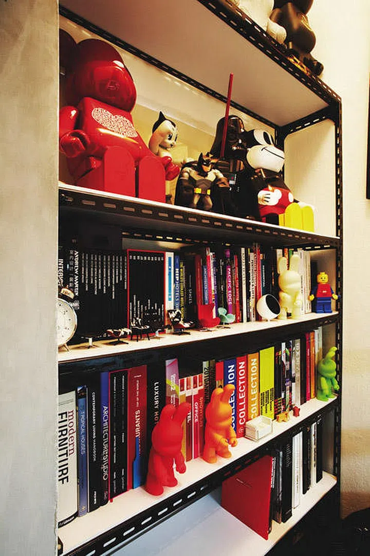 The carefully arranged shelves feature color-coded volumes interspersed with small decorative objects, creating a visually appealing backdrop that reflects Alvin’s passion for design history and contemporary trends.