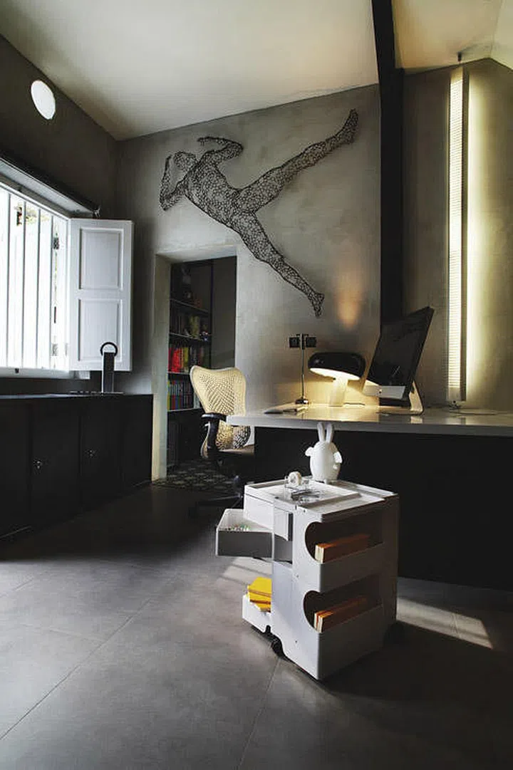 Part of the living room is sectioned into an office space for Alvin’s staff. His own workspace is tucked into a corner – which doubles as a library – behind the wall for extra privacy.