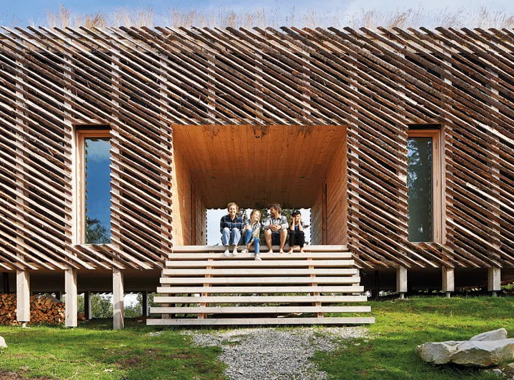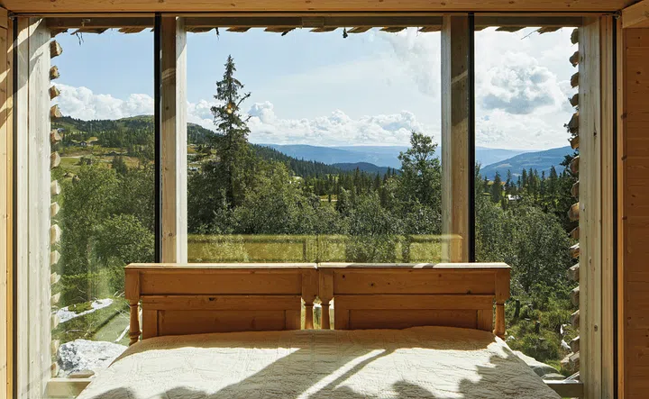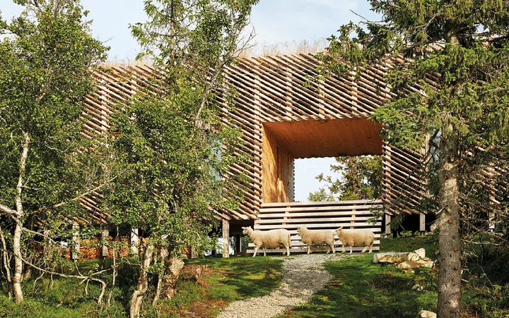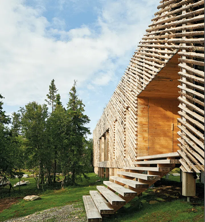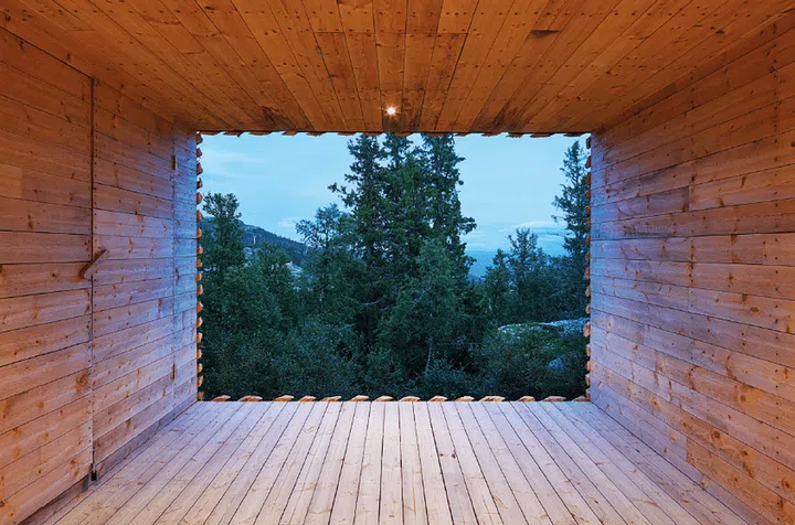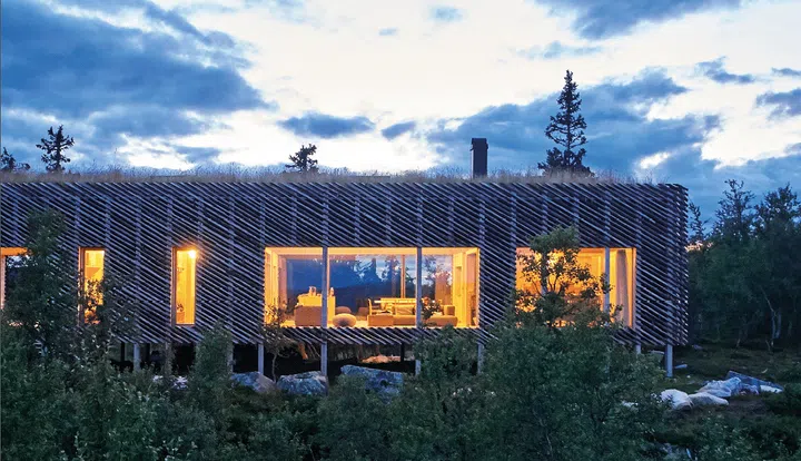 The exterior of the home was designed to blend in with the surrounding rugged landscape and forested vegetation. As a nod to rural architecture, the structure is clad in skigard, 3-metre long quarter-cut logs that are traditionally used by Norwegian farmers for fencing. During winter, snowfall builds up in the gaps between the logs, creating a softer silhouette reminiscent of tree branches laden with snow. The grass top of the cabin also alludes to traditional sod roofs, a common sight on rural log houses in Scandinavia until the late 19th century.