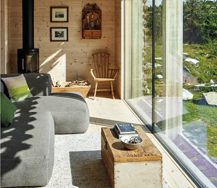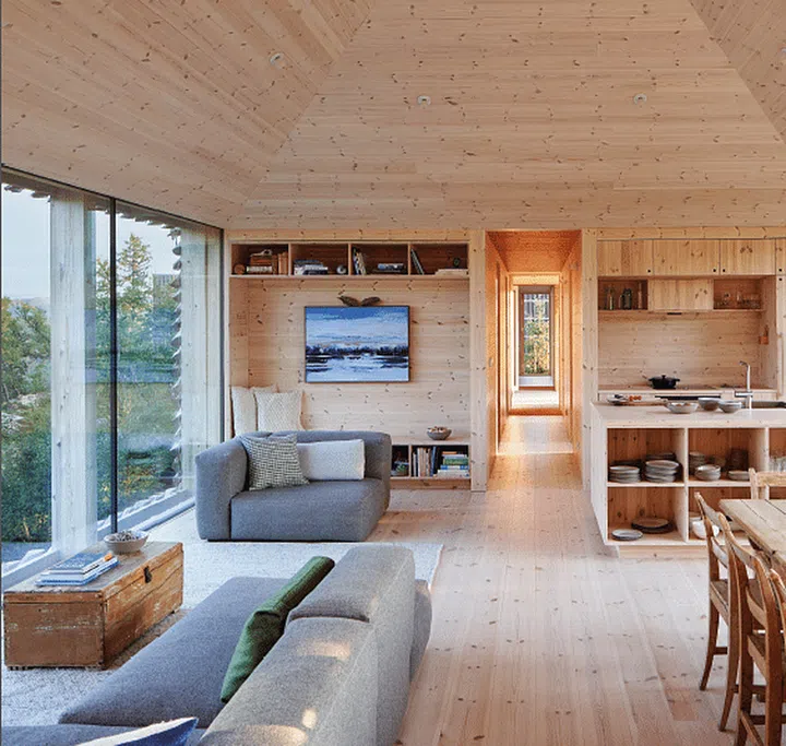 Inside, the space is kept minimal in order not to distract from the view. Light, smooth pine paneling runs all the way around the house, creating an understated look that simultaneously soothes the senses and frames the ever-changing outside scenery through the generous glass walls. The warm wood tones are complemented by other neutrals like grays and the occasional pastel, so nothing jars the eye.