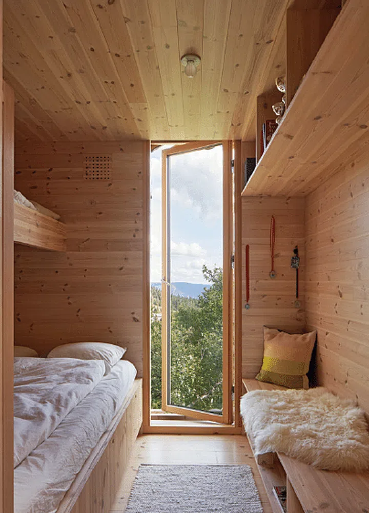 “We were hesitant to have any non-wood materials exposed, so the shower walls and floors, toilet flush plates, ventilation plates, and even the refrigerator handles were crafted from either Furu or Norwegian pine. The sauna is clad in Osp, which is a type of Aspen wood,” says Lexie. With all the pine, even the interior of the house itself smells like the forest it stands next to, bringing in the outdoors in a whole new way.
