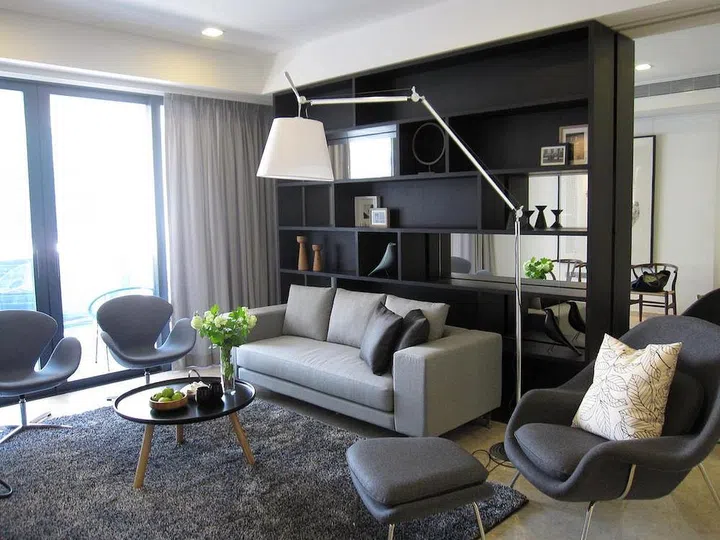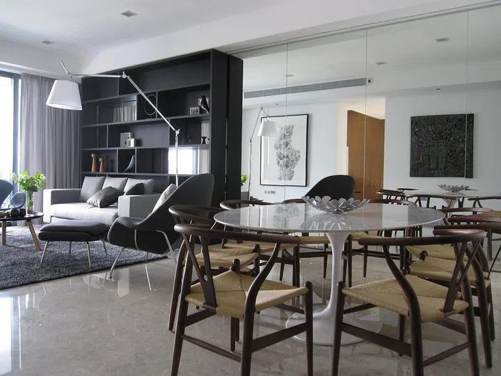 Their designer, Jay Ang, erected a full-height mirror panel along one of the living room walls to give an illusion of space. The display shelves feature sliding doors, giving the owners the option of having open shelves in the dining or living room.