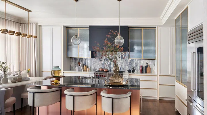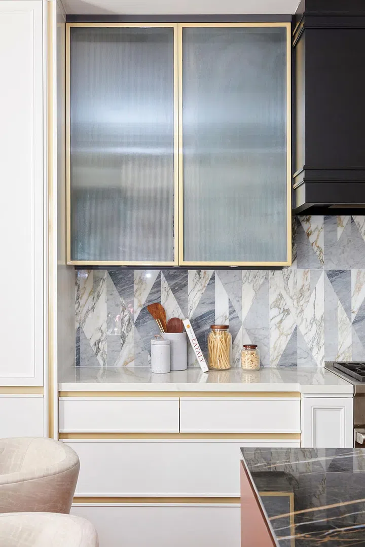 She completely redesigned the space, which now features white-painted cabinetry with gold details, an oversize dark ebony hood, and an Italian marble inlay backsplash with broken down shapes.