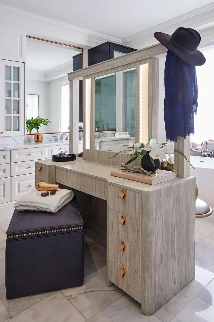 “I love all the different areas we included such as vanities, work area in front of the bed and the oversize custom wardrobe we designed to house our client’s favourite fashion pieces. The silk oversize rug that we incorporated also adds that sense of luxury and warmth to the space," she adds.