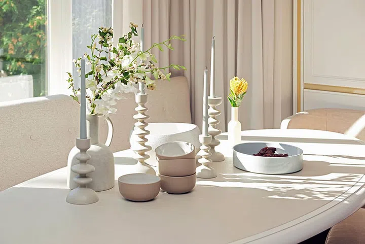 Throughout the home, tones are mostly neutral, creating a chic and relaxing atmosphere with a distinct feminine touch.