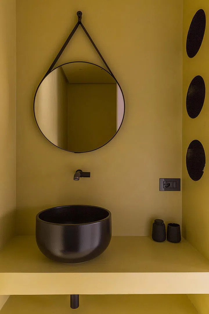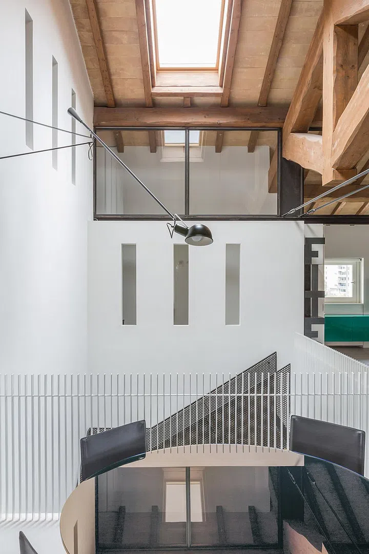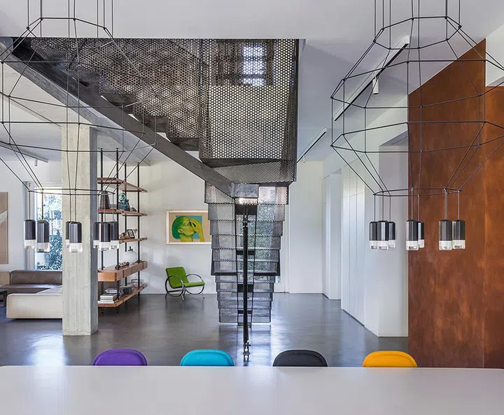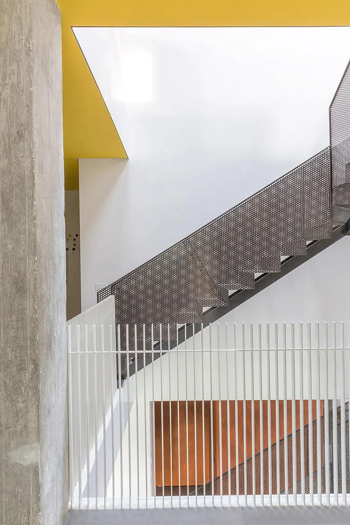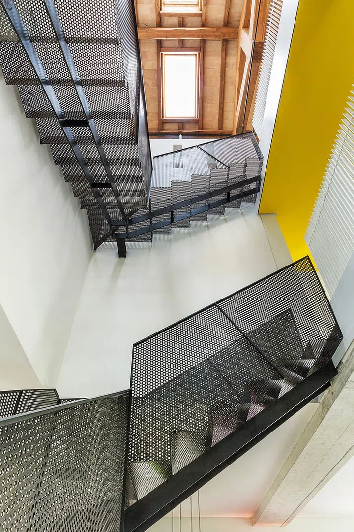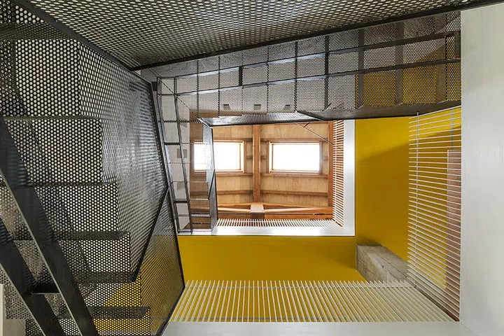 The angles brought about by layering the balustrade, the yellow ceiling and the perforated metal staircase are decidedly eye-catching.