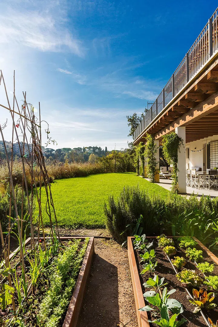 A vegetable garden next to the outdoor dining area links the house and its greater environment.