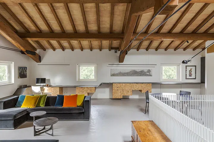 The communal top floor can be used as a living room or a one huge workspace.