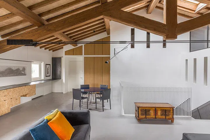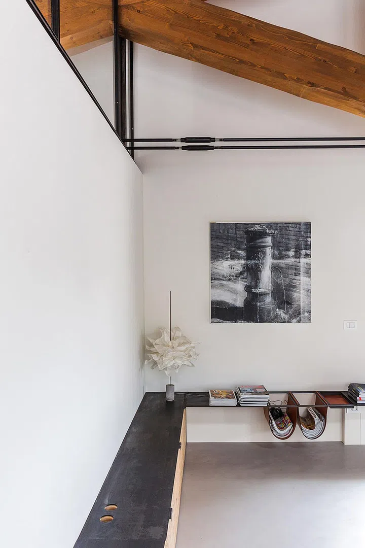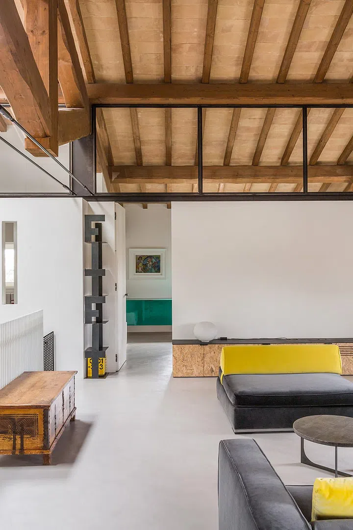 The ground floor has a whitewashed ceiling with concrete flooring and corten steel walls, the first features a cheery yellow ceiling, and the top floor makes the most of its height by exposing the former farmhouse’s original wooden structure.
