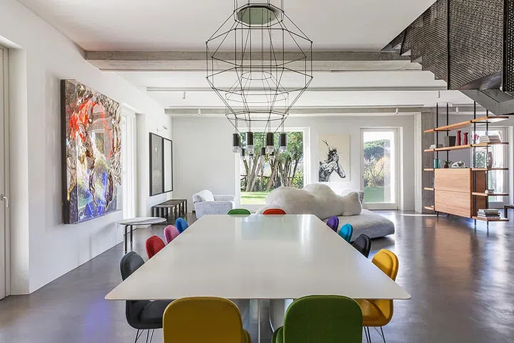 Built on the bones of a former farmhouse, this home-cum-atelier of a designer couple and their four children is a chic combination of bright colours, industrial aesthetics, and fluid indoor-outdoor connection.