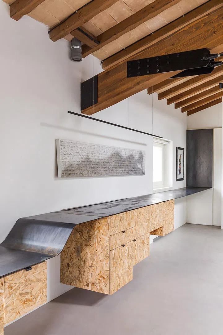 These are connected with one another via a metal ribbon that forms a continuous work surface along the perimeter of the study.