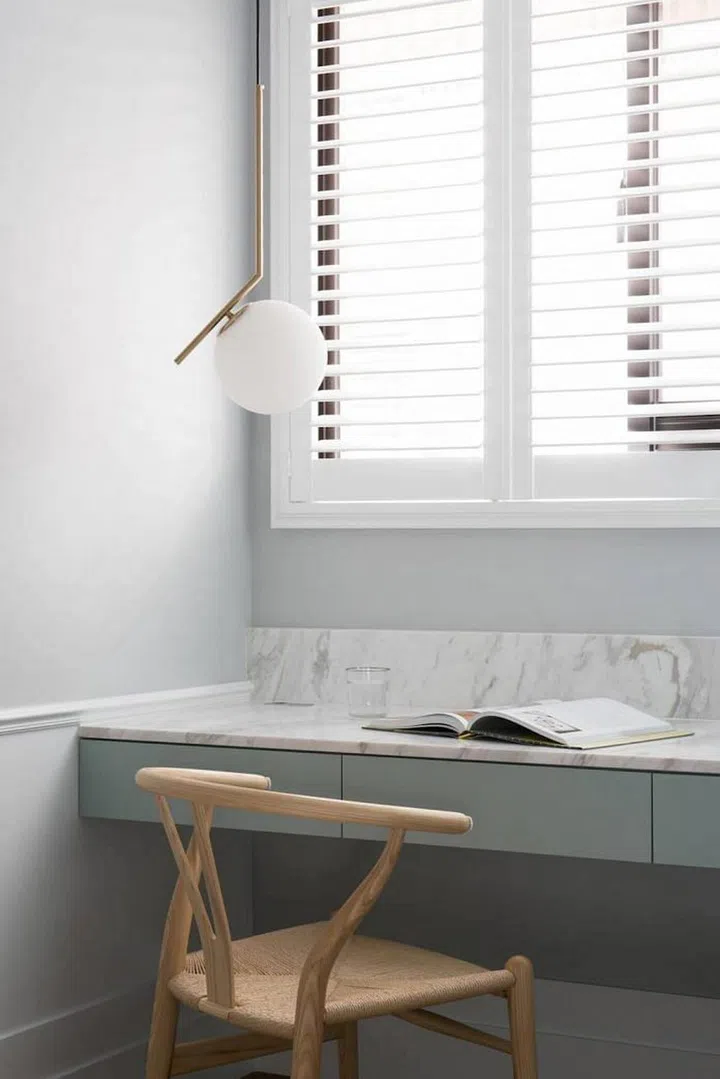 In the study corner, the same white marble is used to line the table top and wall.