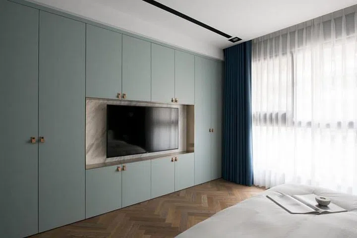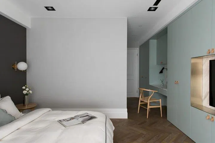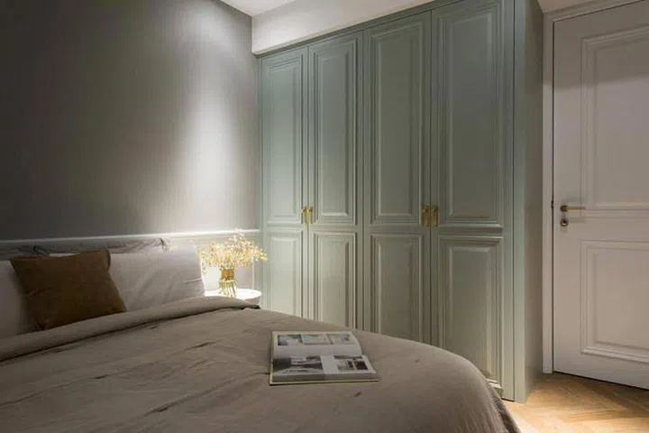 In the bedroom, the colours are kept soft, with details added in the cabinetry and the walls to create depth and character.