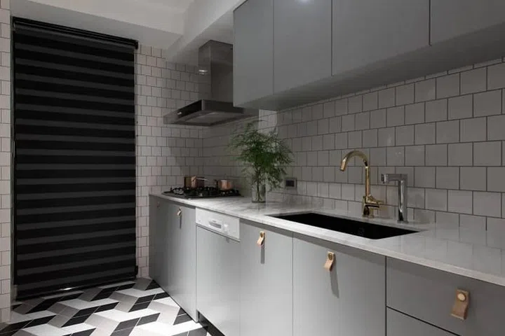 In the kitchen, white subway tiles add interest to the backsplash.