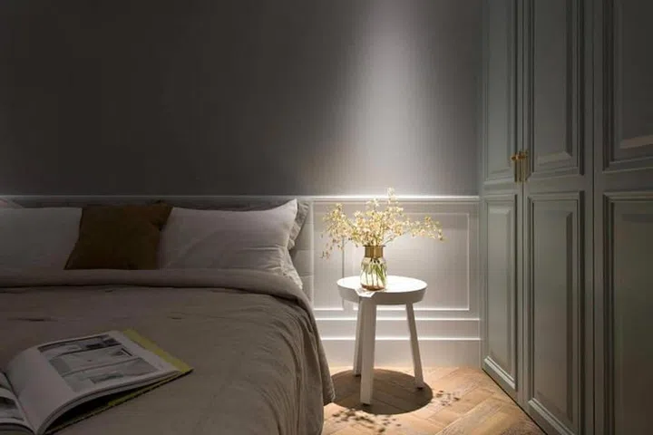 A downlight creates drama in one corner of the bedroom next to the wardrobe.