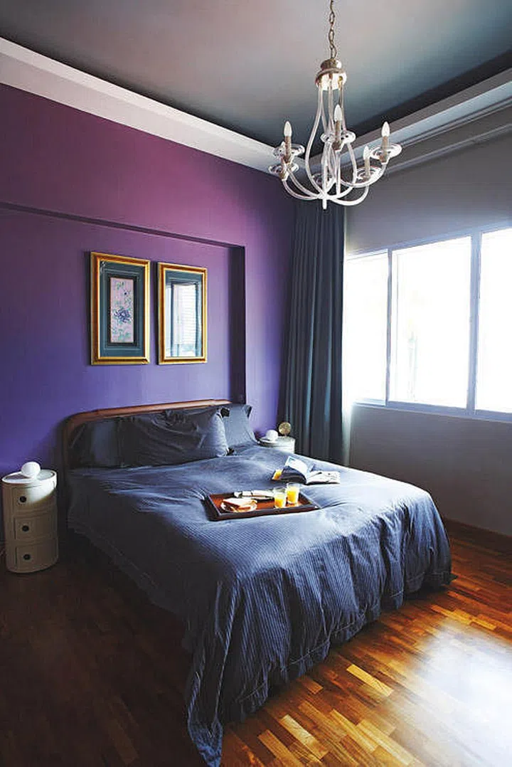 The bedroom, in plum and grey, features Cliff’s first painting (a Chinese floral piece) above the bed.