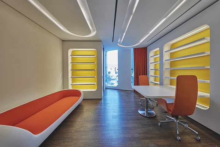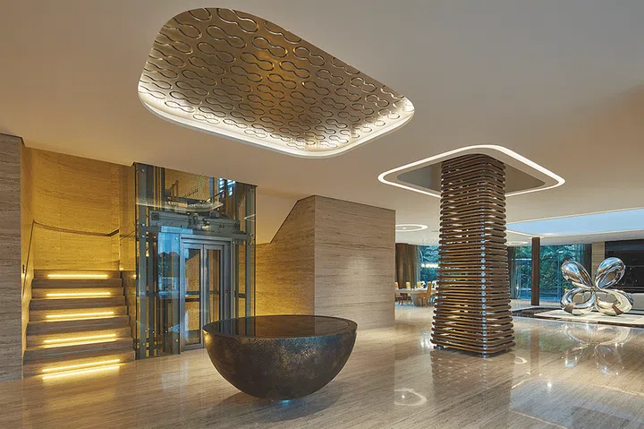 Visitors arrive under a porte-cochere, cross over a footbridge and enter a portal space whose focal point is a 2-metre semi-spherical bowl sculpture called Vase Otto. The light illuminating it directly from above creates a stunning effect.