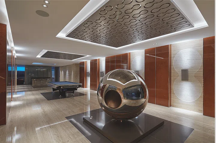 The cruciform plan houses spaces for entertaining, such as a karaoke room, bar, wine cellar and home theatre. It is also where the spa and sauna are located.