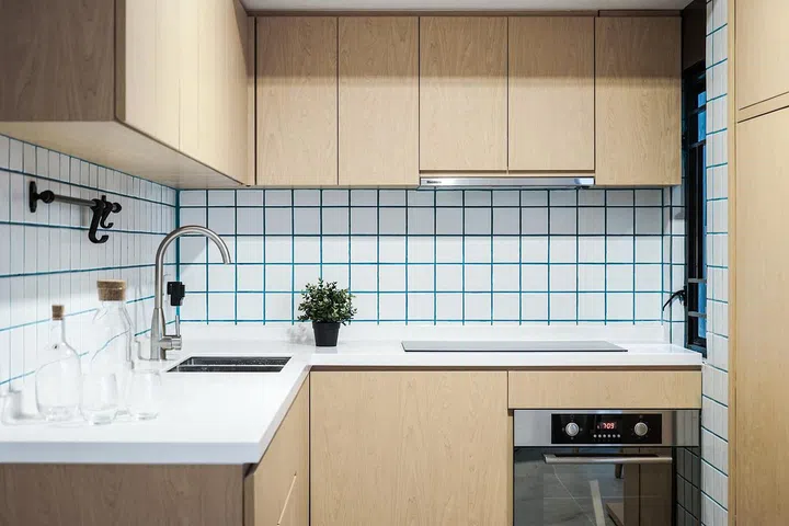 To play up on the linearity here, white square tiles with turquoise grouts fill the backsplash for an added visual appeal.