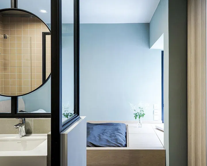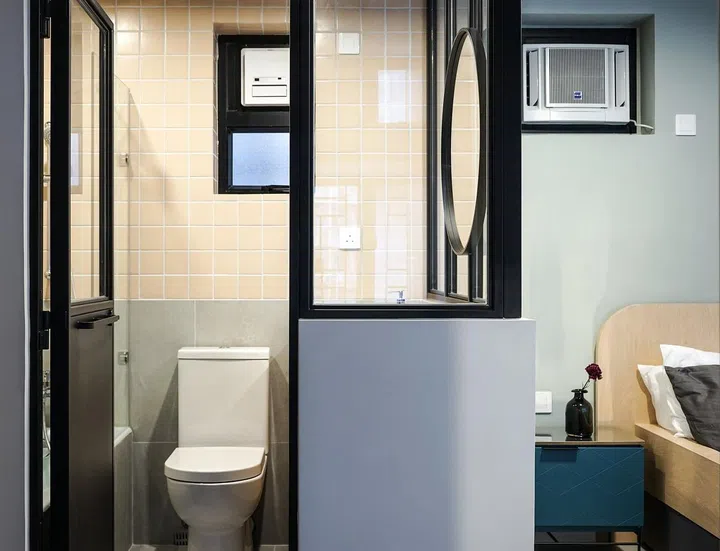 To create a sense of spaciousness in the bedroom, the designer decided on hacking half of the wall of the bathroom and replace it with black framed glass windows. This strategy also keeps the bathroom from looking claustrophobic.