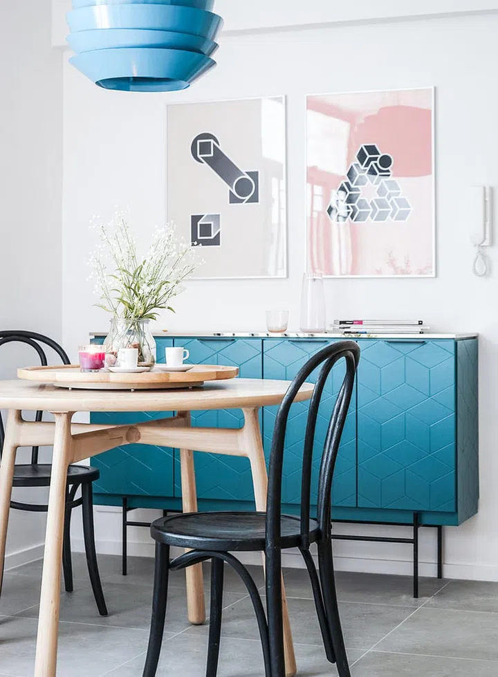 A geometric-patterned sideboard in turquoise sits next to the dining table to offer more countrertop display space and storage.