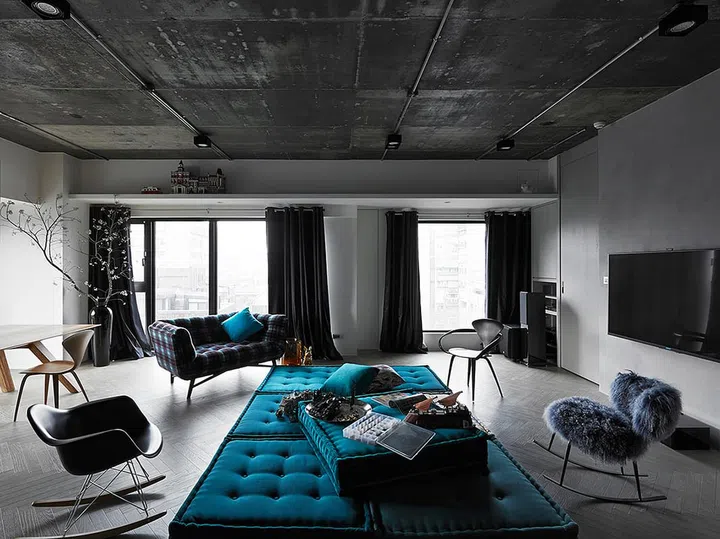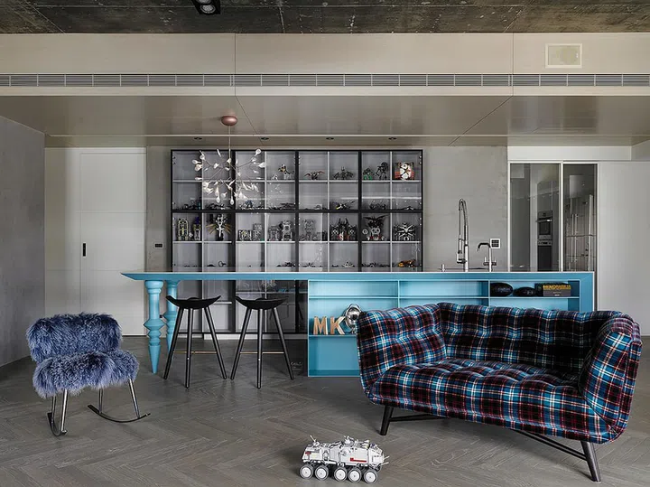 Teal is chosen for the kitchen counter to create a stand-out feature in the centre of the home. Complementary furniture such as a tufted sofa in a checkered fabric, as well as a fur-clad rocking chair are chosen for the living room.