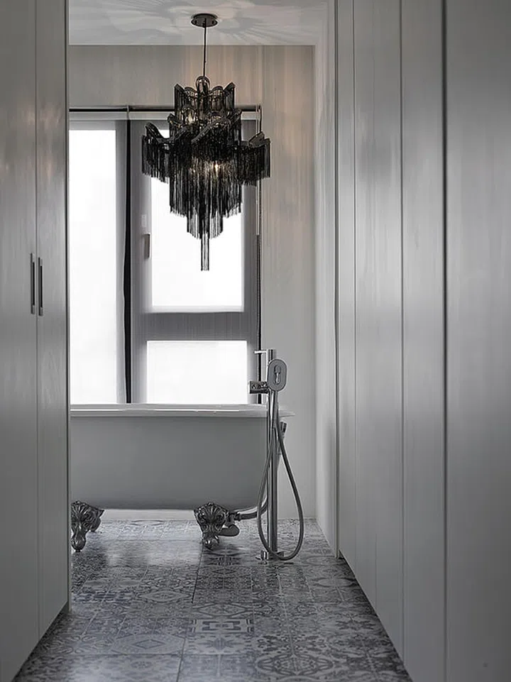 A classy black chandelier sits above the bathtub. When illuminated, its textures are reflected against the walls around it.