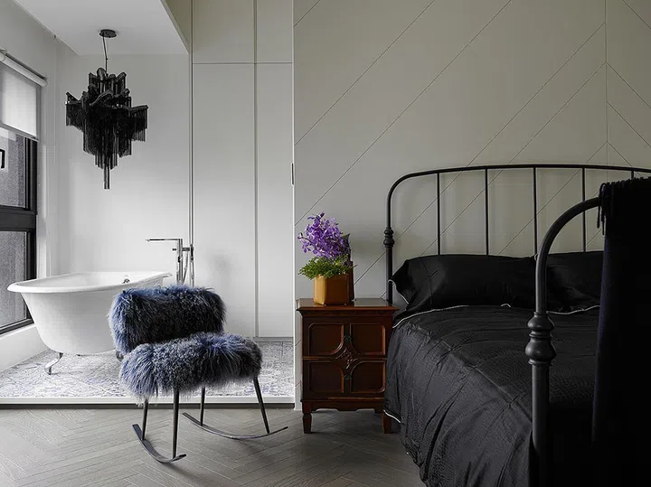 The wall behind the bed has a chevron pattern that draws the eye up. The open-concept bathroom sits next to the bedroom space, and boasts a luxurious freestanding bath tub.