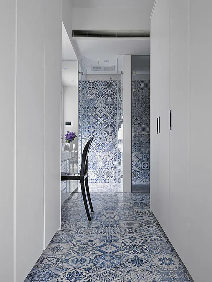 Blue and white patterned tiles fill this space to make itself the most outstanding and bold-designed space in the entire apartment.