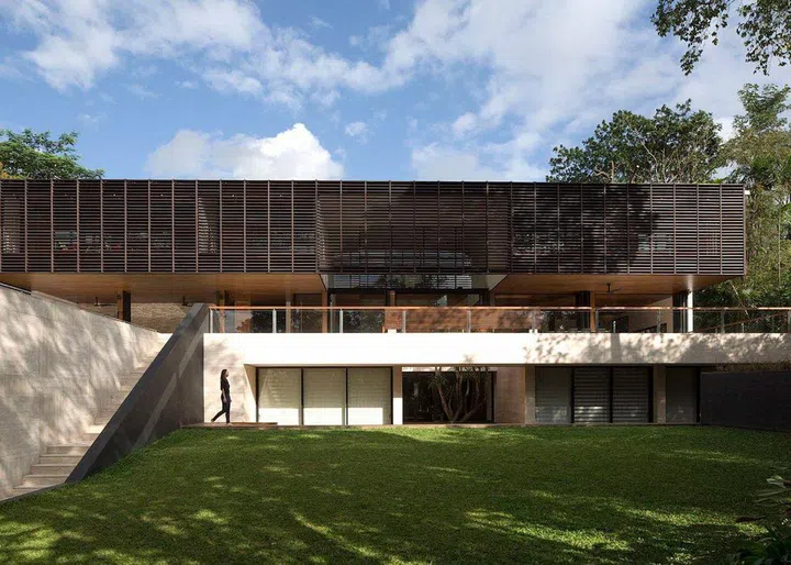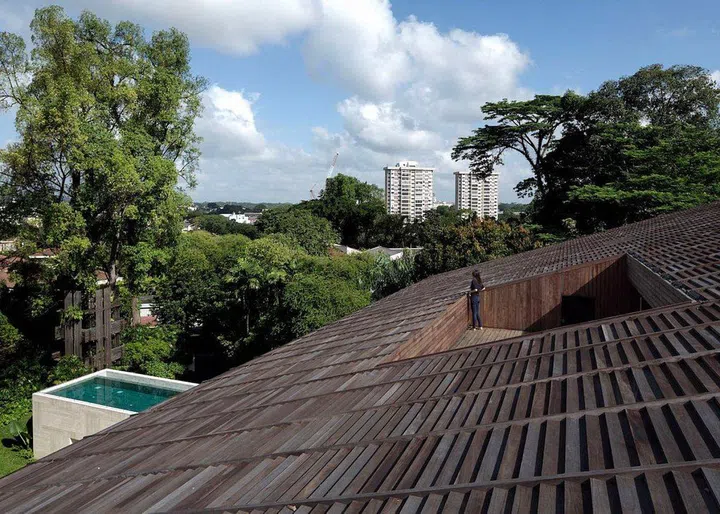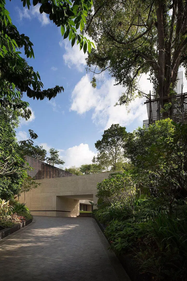 According to the architect, this positioning was also influenced by the layouts of colonial Black-and-White bungalows, where long drive ways lead up the slope to a grand entrance.