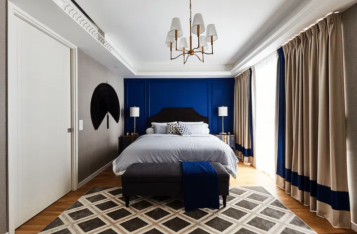 For the master bedroom, Eddy picked out darker shades of the palette to give it a more restful ambience for sleep. To create a larger space, he merged it with an adjacent bedroom.