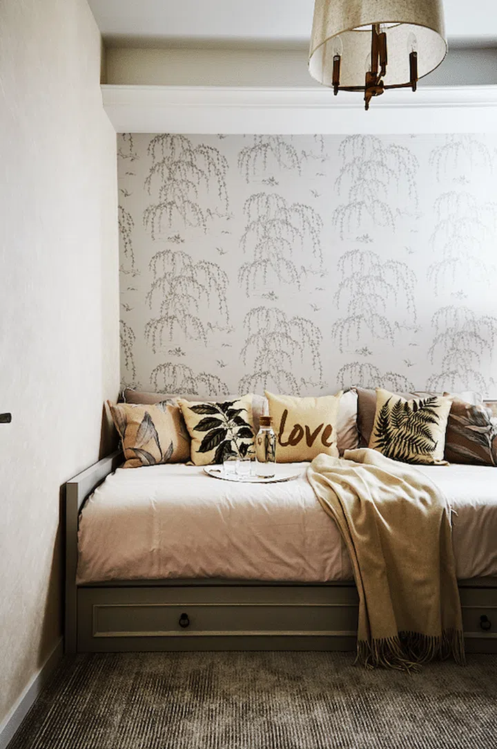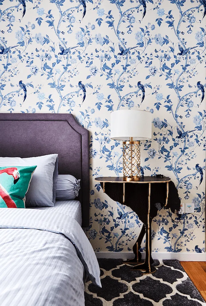 One bedroom features porcelain blue and white wallcovering, complemented by furnishings in muted colours. Eddy also designed a pull-out bed so that more family members could sleep over.