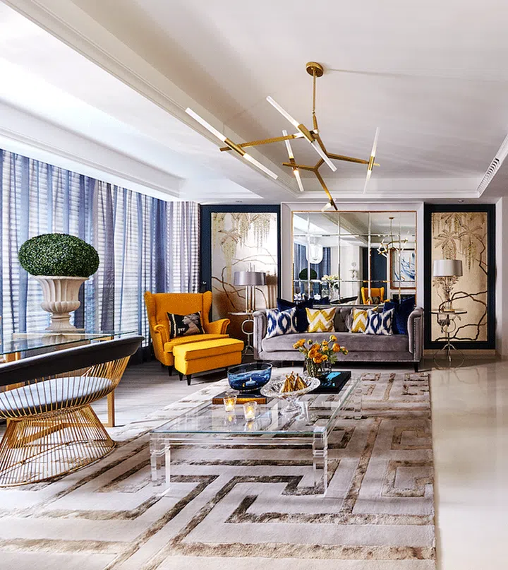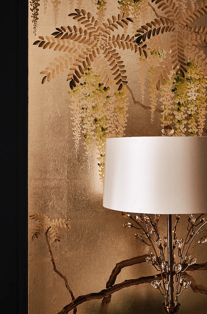 “Metallic finishes, such as this customised wall covering, imbue a sense of luxury. And the artworks have fan details to match the other areas of the home while the blue and yellow in the artworks echo those in the furnishings,” he explains.