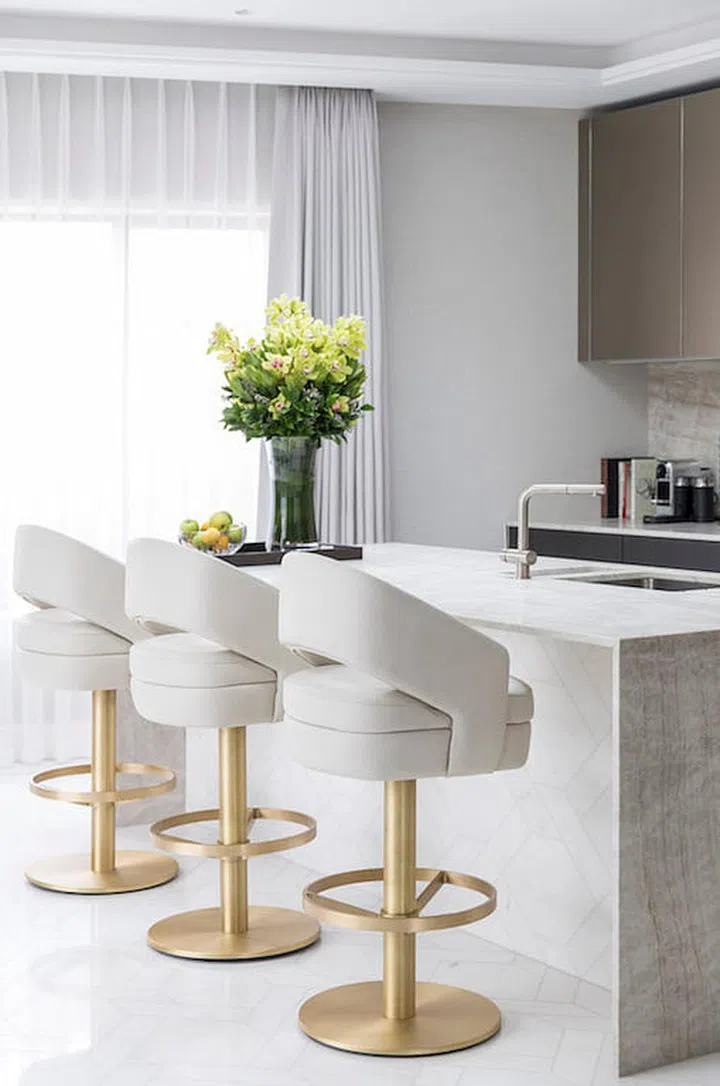 The adjacent dining room has a cool green upholstery to lend a splash of colour alongside the neutral-hued cabinetry.