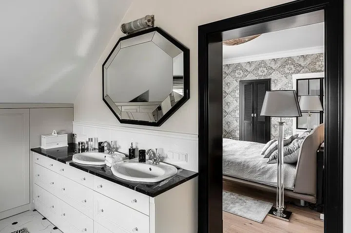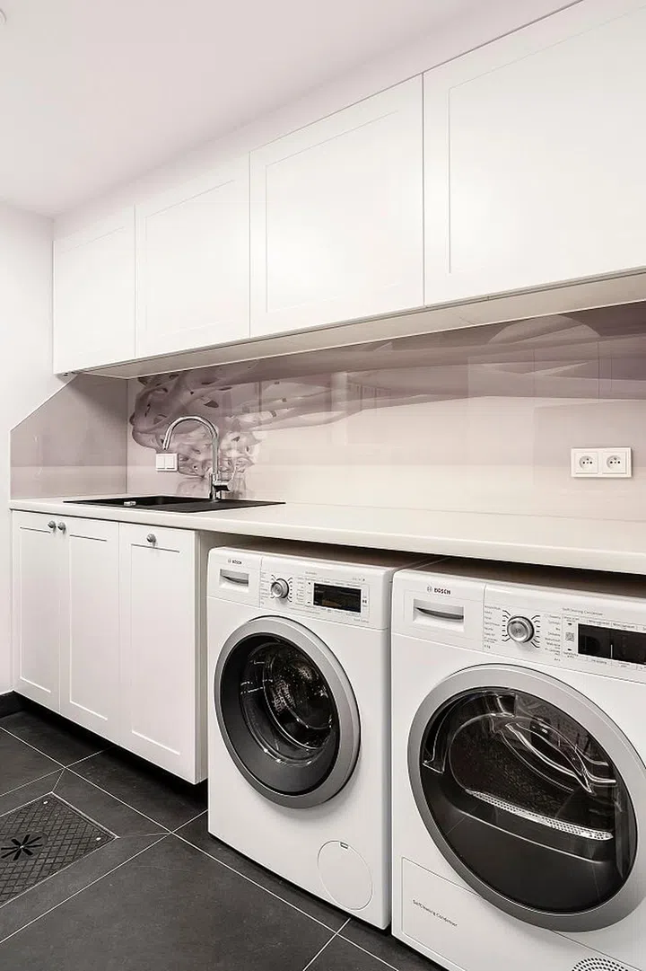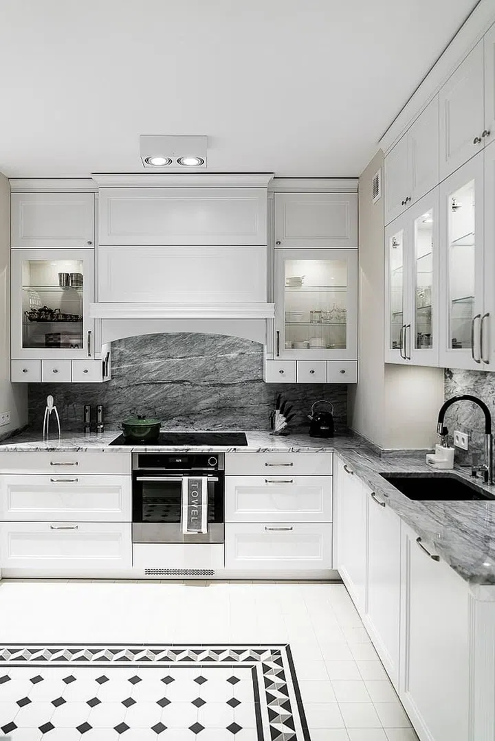 To keep to the monochromatic theme, the designers chose a grey marble backsplash instead of the usual, majority-white palette.