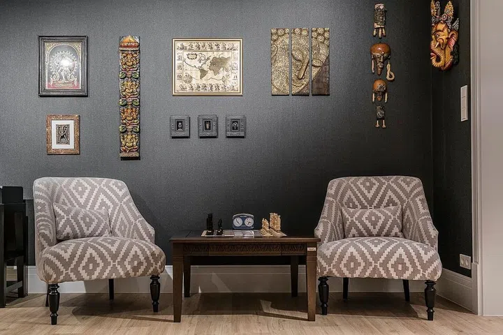 The homeowners travel often and have a collection of souvenirs which they displayed on a black wall.