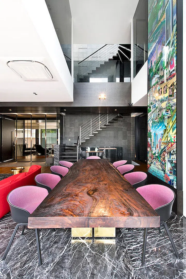 A customised “Shou Sugi Ban” suar wood dining table takes centre stage in the dining room, complemented by a set of chairs from the About A Chair series by Hee Welling.