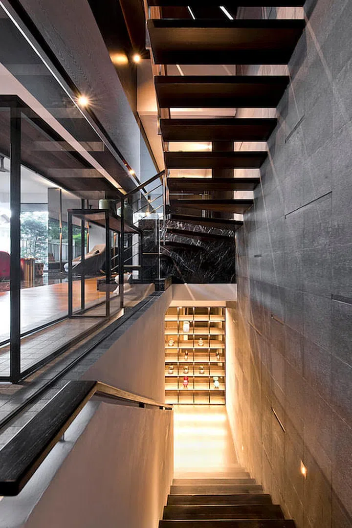 An open-riser staircase maintains porosity within the home, adding a degree of lightness that is juxtaposed against a palette of dark colours and materials.