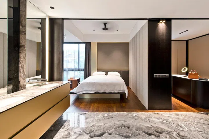 The design of the master bedroom is a continuation of that on the first storey, both with strong linear axes anchoring them.