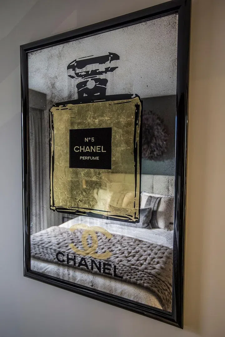 An antique retro mirror with an illustration of one of Chanel’s fragrance bottles lends this space personality, and is testament to the homeowner’s love for the fashion brand.