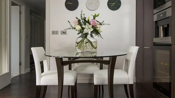 Furniture selection in the dining room was kept pared down and blend with the overall colour palette in the home.