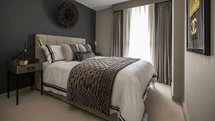 In creating a moody yet bold look in the second bedroom, charcoal greys and darker hues were used.