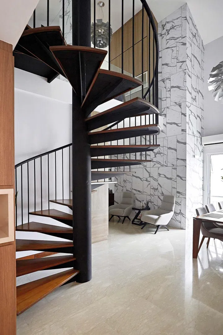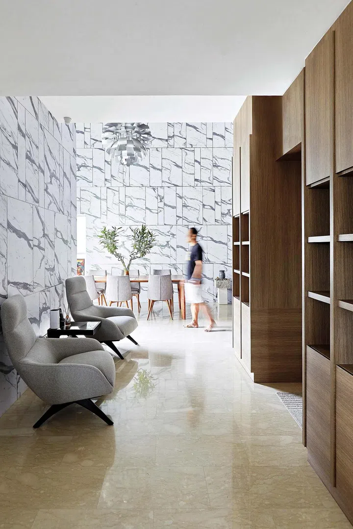 The design of this penthouse apartment in sembawang was guided by one main concept: soaring marble walls.