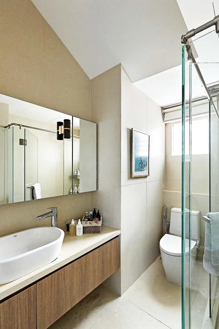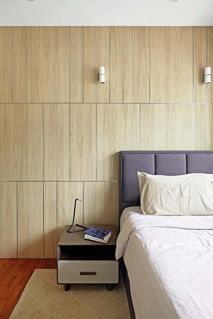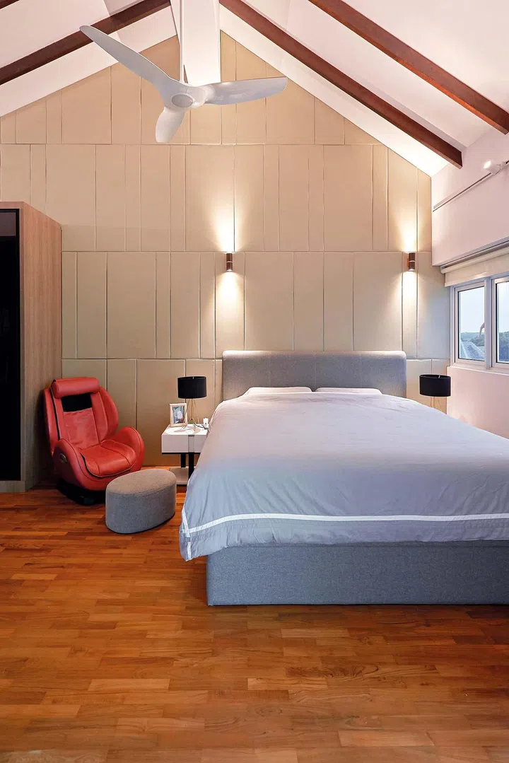 Midway through the renovations, Ai Tiong discovered that the false ceiling in the master bedroom concealed a pitched roof. He had the contractor remove it and restore the exposed timber rafters. The pitched roof gives the master bedroom a loftiness that makes it feel more like part of a landed home than an apartment.