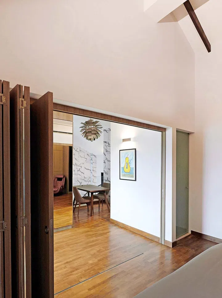 Timber sliding-folding doors take the place of the original walls of the master bedroom, so it’s integrated with the study area.