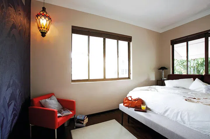 A mix of the modern and retro contributes to this apartment's whimsical, eclectic look. The stained glass pendant lamp and wallpaper with a tropical-foliage print give the reading corner in the master bedroom a colonial-style influence.